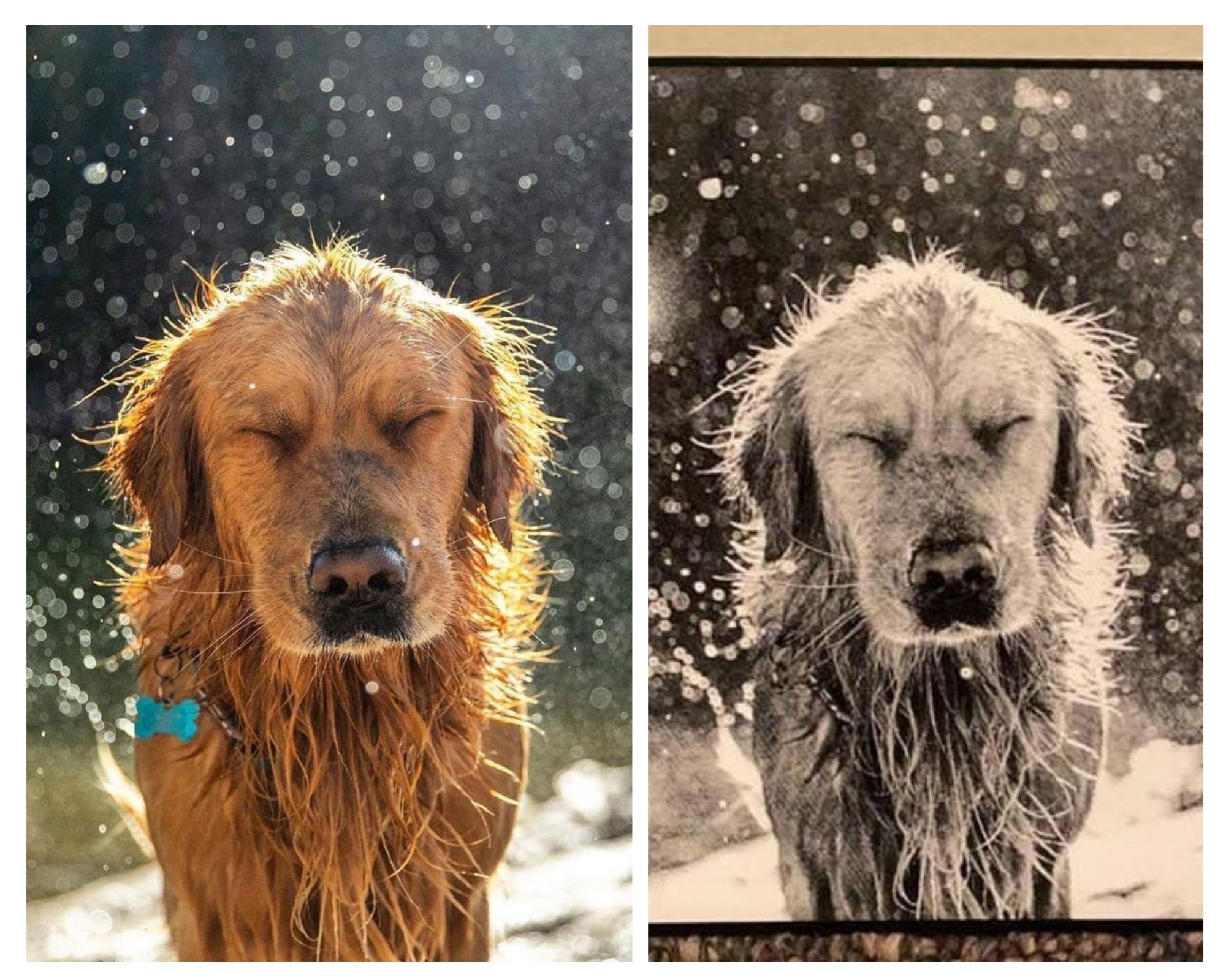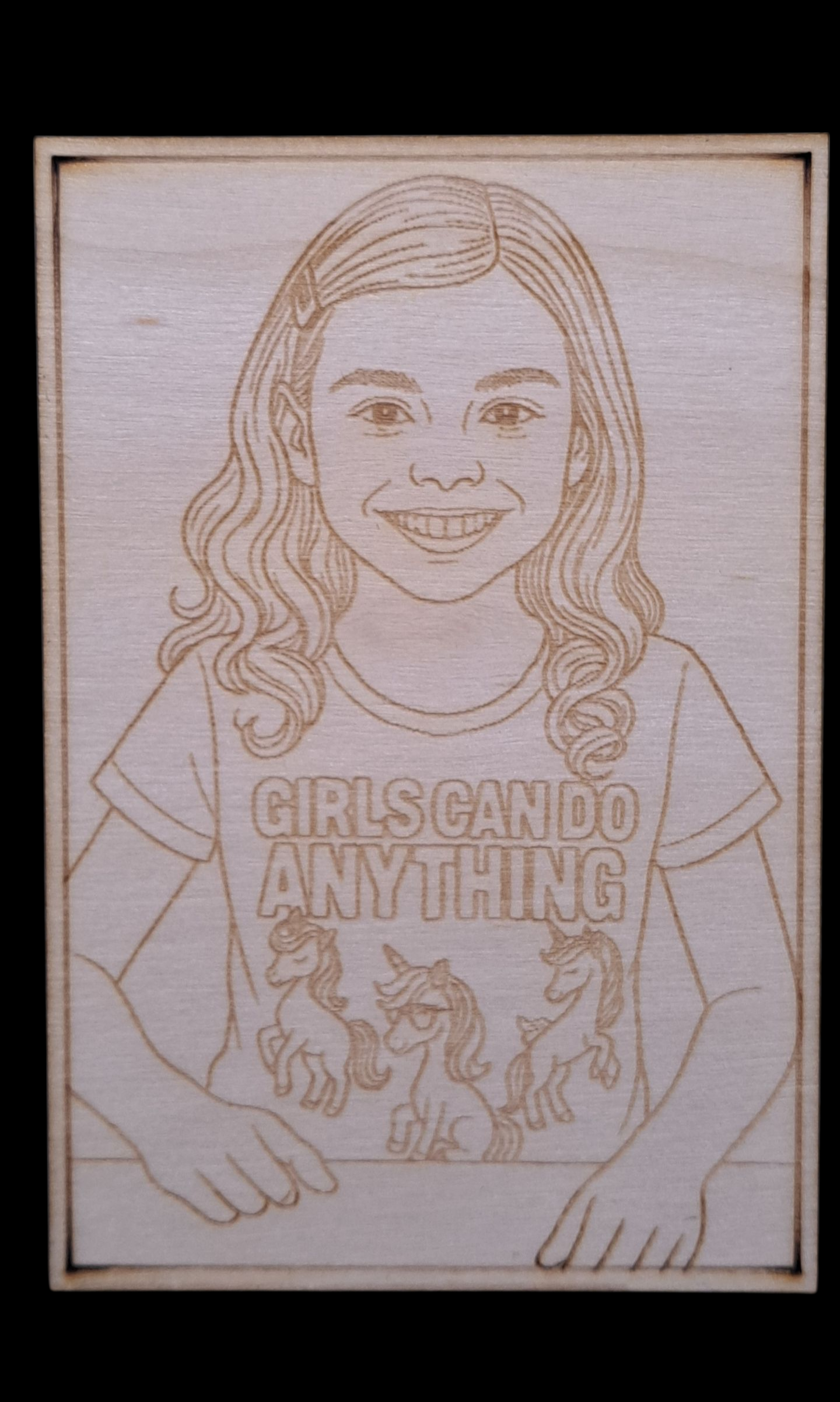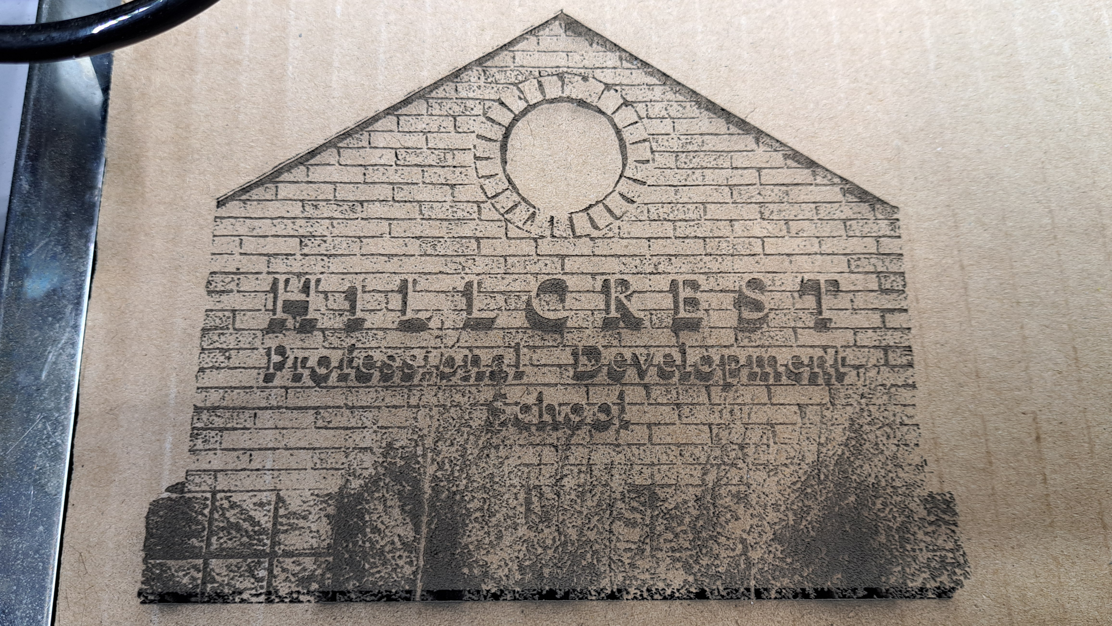 Part of some work for a local pool hall I am working with. I will be working with them on doing custom engraving for their customers and for the custom pool cues they make. Figure if I'm going to mess up anybody's face first, it might as well be mine. Wood is not the best thing for photos of people, but at least you can tell it's me. Test engraving on cardboard of the sign for a school nearby where I volunteer to help maintain their fish pond. Talking to them about maybe doing a brick fundraiser or something similar. This will go on a brick or paver soon. I like using cardboard for testing, cheap, no worry about messing up expensive materials, and it gives a decent engraving.